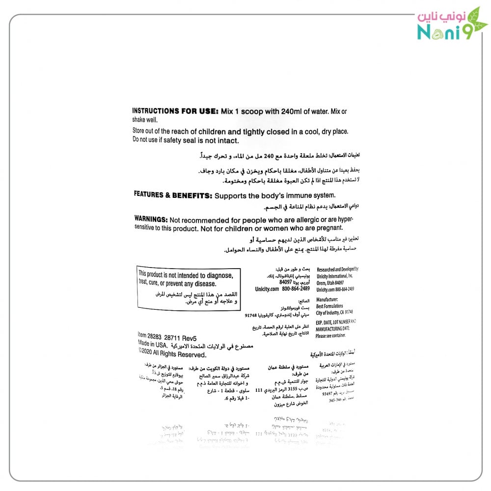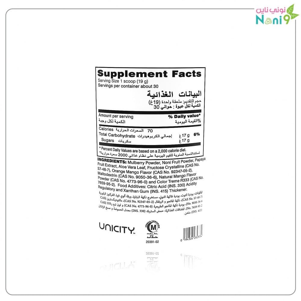 بودرة التوت، بودرة فاكهة النوني، مستخرج نكهة البابايا، ورقة ألوي فيرا، الفركتوز البلورية، نكهة المانجو والبرتقال، مالتوديكسترين، بودرة نكهة المانجو الطبيعية، حمض الستريك، معدل الحموضة وصمغ الزانثان، مثخن.